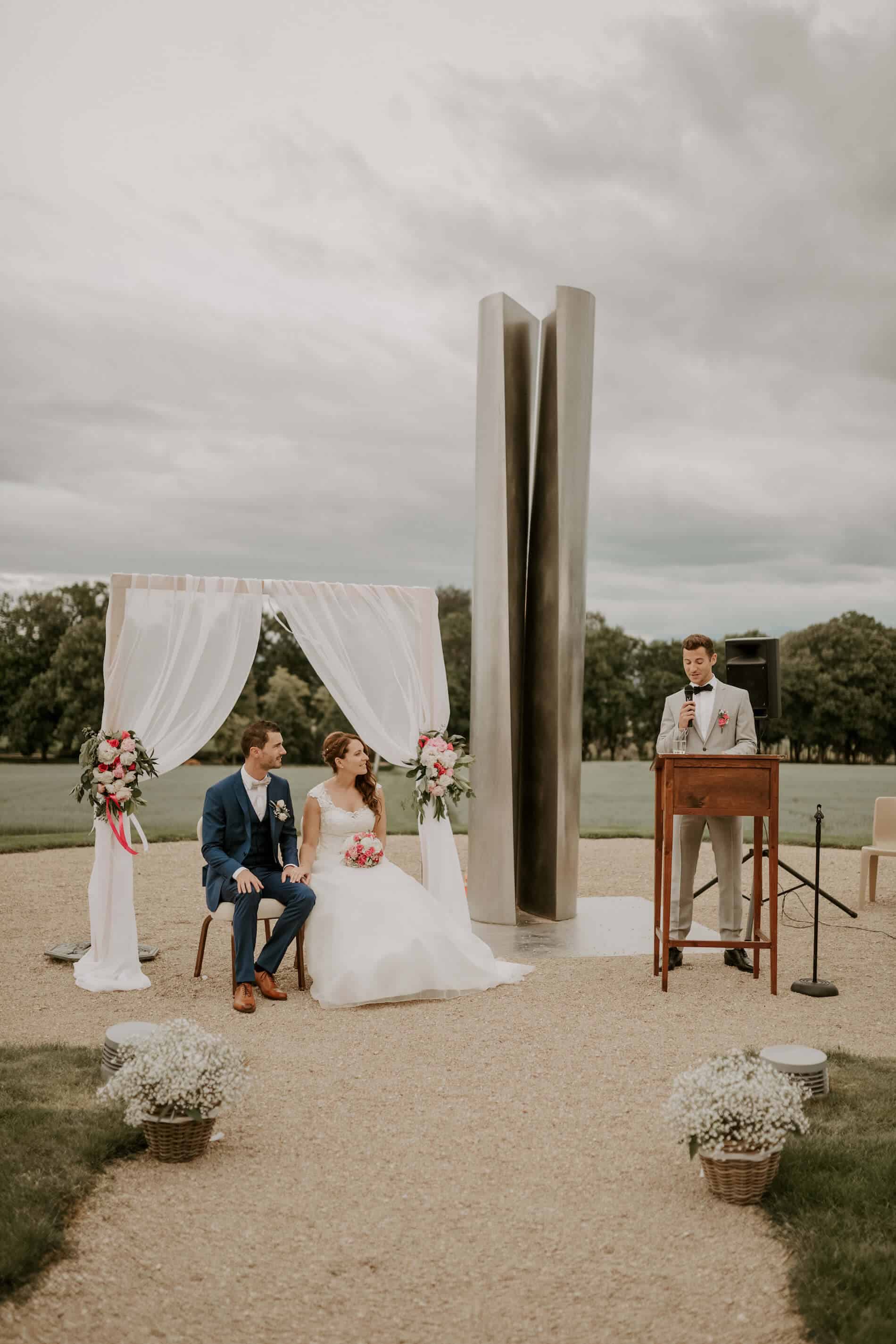 15 minutes avant la fin de la cérémonie, le vent commence à se lever, nous voyons les nuages s’approcher de plus en plus menaçant. Le ciel devient noir et la température se rafraichit très rapidement. Nous commençons à espérer que la cérémonie se termine avant l’orage. Soulagement! Dès les dernières notes, nous invitons les invités à former une haie d’honneur à l’intérieur du Bâtiment pour accueillir les mariés au sec dans la salle pour l’apéritif. Pendant ce temps nous nous affairons avec l’intendant du Domaine à rentrer toutes les décorations, puis à plier les parasols qui s’envolent. Il commence a pleuvoir quand nous empilons les chaises et nous finissons de rentrer le dernier mobilier sous la grêle. Nous sommes trempés jusqu’à l’os mais heureux de ce timing qui n’aurait pas pu être plus parfait !