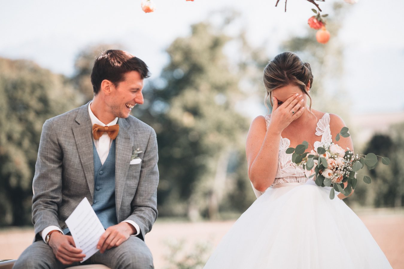 La première phase a été celle de l’action: il-faut-tout-de-suite-reporter! Mais elle n’a pas duré longtemps, car très vite, nous avons dû faire face à la deuxième phase, à savoir celle de l’incertitude. En effet, beaucoup de questions se sont posées, notamment celle de trouver une nouvelle date (toujours en 2020? ou en 2021? Printemps? Eté? Automne? Hiver?), sachant que beaucoup de dates étaient déjà réservées. Il a s’agissait ensuite de s’assurer que tous les prestataires étaient libres à la même date. S’ajoutaient à ces difficultés les différents avis de notre entourage concernant le report du mariage, et tout l’émotionnel qui s’y rattache. Cette phase était clairement la plus lourde. Ensuite est venue la phase de l’acceptation: accepter que nous devons aller de l’avant, recommencer certaines choses au niveau de l’organisation, etc. La dernière phase était la meilleure, celle de la réjouissance. Malheureusement, elle n’est arrivée que très tardivement car nous étions à nouveau dans une période incertaine au niveau du COVID. Mais elle fut très intense!