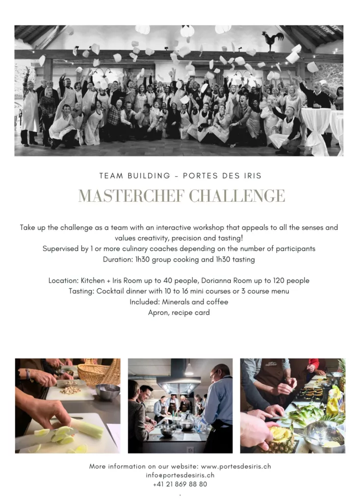 Master Chef Challenge, Percussion Workshop, Rally in the heart of the most spectacular gardens in Switzerland, Creation of a collective terrarium, Escape room, Challenges of the fort, Lego play, Venue play, Criminal investigation, 60 brain challenges, Creation of a common fresco, Fil’Art and many others.