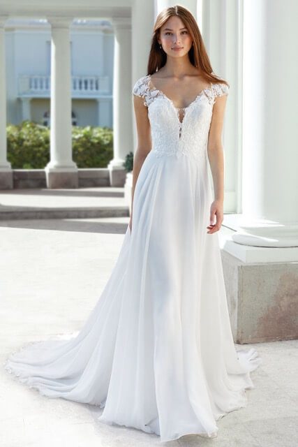 Close-fitting, feminine, flowing silhouettes. A pared-down, “less is more” style, sublimely smooth, luminous materials, a look that’s easy to accessorize with a beautiful veil or more showy jewelry… Satin, crepe, silk chiffon…