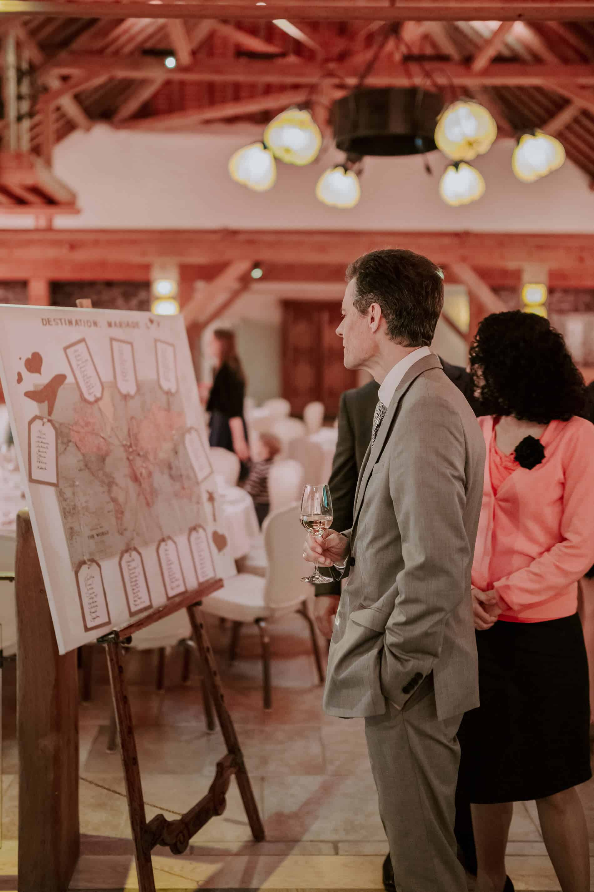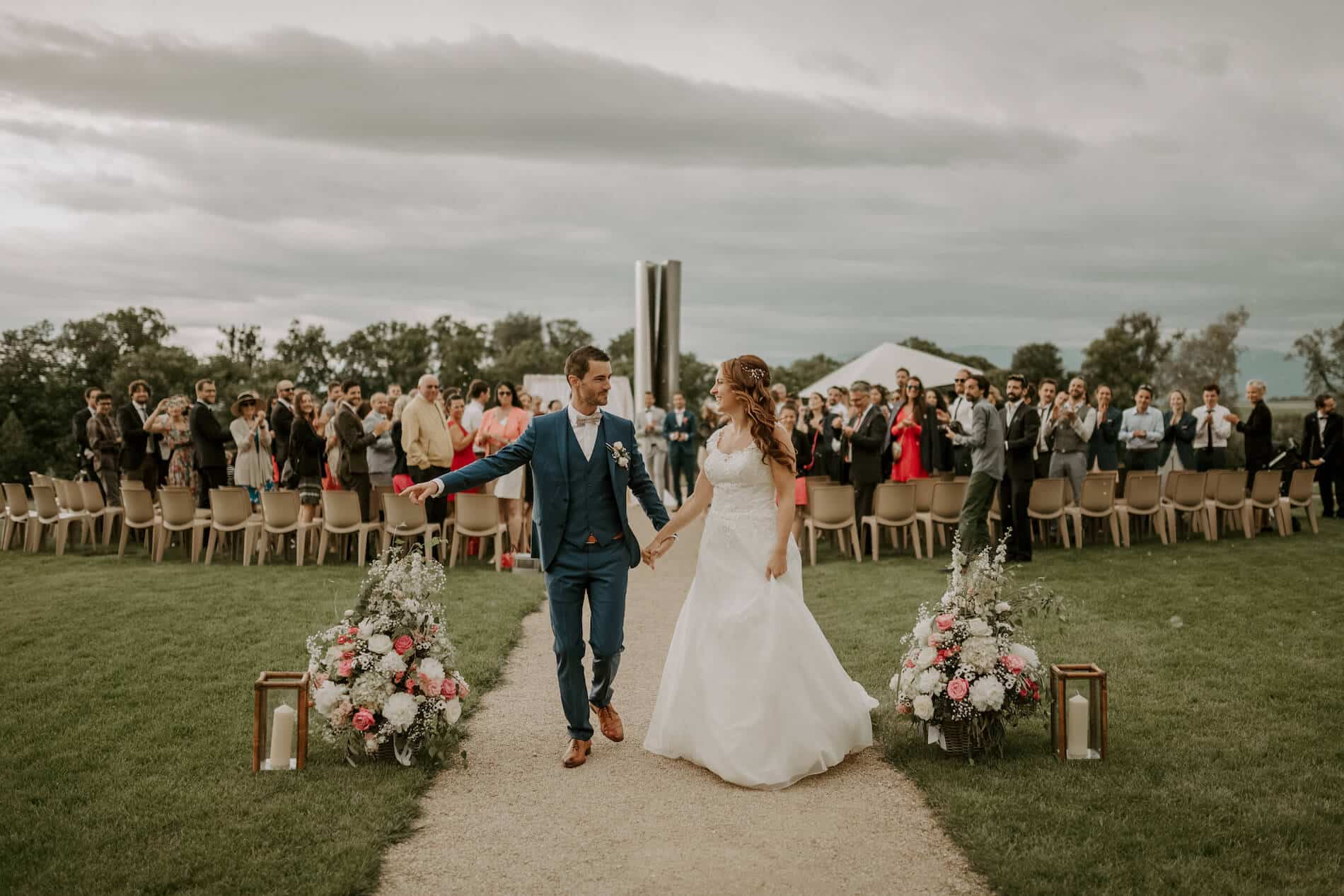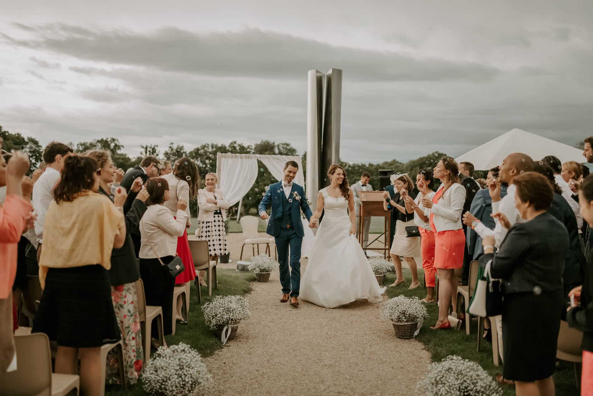 15 minutes before the end of the ceremony, the wind begins to rise, we see the clouds approaching more and more threatening. The sky becomes black and the temperature cools down very quickly. We begin to hope that the ceremony will end before the storm. Relief! As soon as the last notes are made, we invite the guests to form a hedge of honor inside the Building to welcome the bride and groom dry in the room for the aperitif. During this time we are busy with the estate’s intendant to put in all the decorations, then to fold up the sunshades that are flying away. It starts to rain when we stack the chairs and we finish to bring in the last furniture under the hail. We are soaked to the bone but happy with the timing which could not have been more perfect!