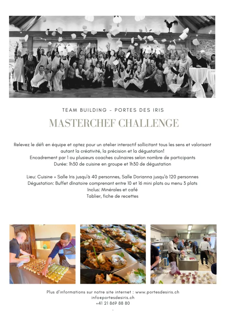 Défi Masterchef, Atelier de Percussions, Rallye au coeur des jardins les plus spectaculaires de Suisse, Création d’un terrarium collectif , Escape room, Défis du fort, Lego play, Venue play, Enquête criminelle, 60 défis cérébraux, Création d’une fresque commune, Fil’Art et bien d’autres encore.