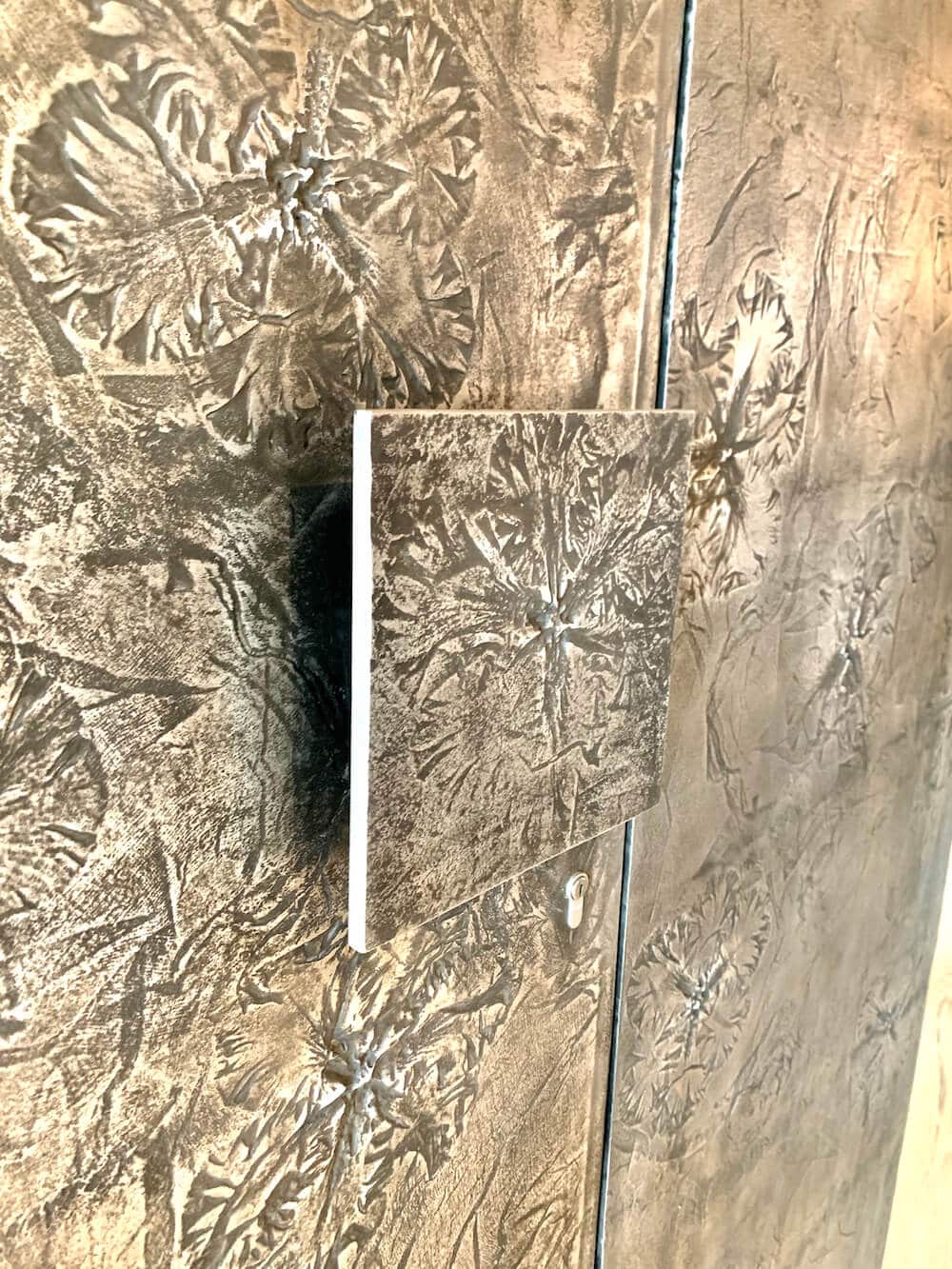 De nombreuses étapes ont été nécessaires pour finaliser le projet. Des fleurs fraîches ont été délicatement déposées dans une terre de modelage puis une empreinte de silicone suivit d’un moule de résine ont été réalisés. La fonderie Gilles Petit à Fleurier a ensuite créé un moule de sable afin d’y couler l’aluminium. Les plaques ont ensuite été montées et installées sur des structures par une menuiserie réputée de la région qui avait d’ailleurs effectué les rénovations de la magnifique charpente de la ferme datant du XVIème siècle.